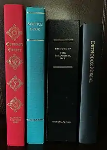 Officially, the AWRV provides one liturgical book, Orthodox Missal,[42] which contains both the Liturgy of Saint Tikhon and the Liturgy of Saint Gregory, with appropriate propers for seasons, feasts, saints, and prayers before and after Mass. The Antiochian Archdiocese publishes the Saint Andrew Service Book (SASB),[43] also known as The Western Rite Service Book,[44] which was developed by Saint Michael's Church in California under the leadership of the late Father Michael Trigg; the 1996 second and 2005 third editions of the SASB received official sanction from Metropolitan Philip Saliba, with the latter containing explicit reference to the authorized nature of all previous editions of the SASB.[43] In addition to duplicating the contents of The Orthodox Missal, the SASB also includes forms for Matins and Vespers, the Benediction of the Blessed Sacrament, and the threefold Amen common to the Byzantine epiclesis but absent in The Orthodox Missal. The SASB was produced by the Antiochian Archdiocese without the participation of the AWRV.[44]