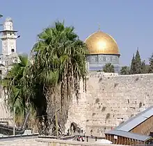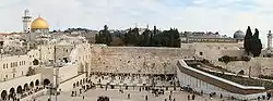 Panorama of the Western Wall with the Dome of the Rock (left) and al-Aqsa mosque (right) in the background
