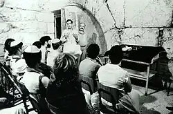 In the late 1830s a wealthy Jew named Shemarya Luria attempted to purchase houses near the Wall, but was unsuccessful,[52] as was Jewish sage Abdullah of Bombay who tried to purchase the Western Wall in the 1850s.[53] In 1869 Rabbi Hillel Moshe Gelbstein settled in Jerusalem. He arranged that benches and tables be brought to the Wall on a daily basis for the study groups he organised and the minyan which he led there for years. He also formulated a plan whereby some of the courtyards facing the Wall would be acquired, with the intention of establishing three synagogues—one each for the Sephardim, the Hasidim and the Perushim.[54] He also endeavoured to re-establish an ancient practice of "guards of honour", which according to the mishnah in Middot, were positioned around the Temple Mount. He rented a house near the Wall and paid men to stand guard there and at various other gateways around the mount. However, this set-up lasted only for a short time due to lack of funds or because of Arab resentment.[55] In 1874, Mordechai Rosanes paid for the repaving of the alleyway adjacent to the wall.[56]
