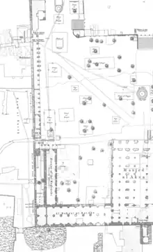 Several Jewish authors of the 10th and 11th centuries write about the Jews resorting to the Western Wall for devotional purposes.[34][5] Ahimaaz relates that Rabbi Samuel ben Paltiel (980–1010) gave money for oil at "the sanctuary at the Western Wall."[35][36][37] Benjamin of Tudela (1170) wrote "In front of this place is the Western Wall, which is one of the walls of the Holy of Holies. This is called the Gate of Mercy, and hither come all the Jews to pray before the Wall in the open court." The account gave rise to confusion about the actual location of Jewish worship, and some suggest that Benjamin in fact referred to the Eastern Wall along with its Gate of Mercy.[38][39] While Nahmanides (d. 1270) did not mention a synagogue near the Western Wall in his detailed account of the temple site,[40] shortly before the Crusader period a synagogue existed at the site.[41] Obadiah of Bertinoro (1488) states "the Western Wall, part of which is still standing, is made of great, thick stones, larger than any I have seen in buildings of antiquity in Rome or in other lands."[42]
