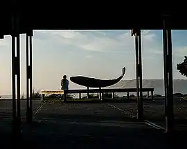 Whale is a 9-foot (2.7 m) sculpture installed at,[1] and the namesake of, Whale Park (or Hemlock Street Park),[2][3] located at the north end of downtown Cannon Beach. The sculpture commemorates the visit by members of the Lewis and Clark Expedition's Corps of Discovery in January 1806, including William Clark and Sacagawea, who explored the area to investigate reports of a beached whale.[4][5] It measures 4 feet (1.2 m) x 3.5 feet (1.1 m) x 10 feet (3.0 m) and is positioned horizontally on top of two metal posts anchored in a concrete base which is 2 feet (0.61 m) tall. The whale's head and tail are elevated. The underside of its proper right flipper contains an unintelligible signature by the artist which may read "Hartwick".[2] The original artist that carved the wood sculpture was Gregory Alan Hartwick.