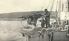 Photo from circa 1920, showing a whaling cannon loaded with a harpoon and ready to fire