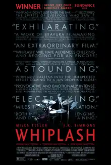 Whiplash premiered in competition at the 2014 Sundance Film Festival on January 16, 2014, as the festival's opening film; it won the Audience Award and Grand Jury Prize for drama.[5] The film opened in limited release domestically in the United States and Canada on October 10, 2014, gradually expanding to over 500 screens and finally closing on March 26, 2015. The film received widespread acclaim for its screenplay, direction, film editing, sound mixing, and Teller's and Simmons's performances, and grossed $49 million on a $3.3 million budget, making it Chazelle's highest grossing feature until La La Land (2016). The film received multiple awards and nominations, winning Academy Awards for Best Film Editing and Best Sound Mixing, and also being nominated for Best Picture and Best Adapted Screenplay. Simmons's portrayal of Fletcher won him the Academy, BAFTA, Critics' Choice, Golden Globe, and Screen Actors Guild awards for Best Supporting Actor. It has since been cited as one of the best films of the 2010s and the 21st century.[6][7][8][9][10]