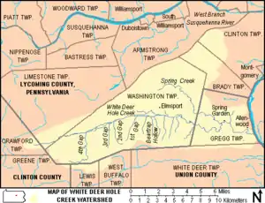 The White Deer Hole Creek watershed consists of 0.08 percent of the area of Clinton County, 4.40 percent of the area of Lycoming County, and 3.67 percent of the area of Union County. Neighboring watersheds are the West Branch Susquehanna River and its minor tributaries (north and east), White Deer Creek (south), and Fishing Creek (west).[3]