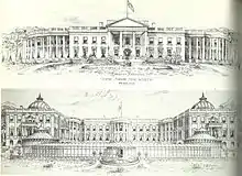 ![]() Top: The Executive Residence's northern facade with a columned portico facing the North Lawn and Lafayette Square Bottom: The Executive Residence's southern facade with a semi-circular portico facing the South Lawn and The Ellipse | |