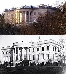 After the fire, President James Madison resided in the Octagon House from 1814 to 1815, and then in the Seven Buildings from 1815 to the end of his term.[51] Meanwhile, both Hoban and Latrobe contributed to the design and oversight of the reconstruction, which lasted from 1815 until 1817. The south portico was constructed in 1824 during the James Monroe administration. The north portico was built in 1830.[27] Though Latrobe proposed similar porticos before the fire in 1814, both porticos were built as designed by Hoban.[52] An elliptical portico at Château de Rastignac in La Bachellerie, France, with nearly identical curved stairs, is speculated as the source of inspiration due to its similarity with the South Portico,[53] although this matter is one of great debate.[54]
