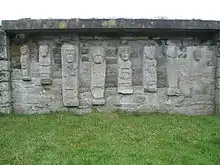 The ruined church on the island has a reconstructed plain Romanesque doorway. Secured to the north side of the south wall are eight carvings (seven figures and one head) built into the masonry of the church.[3] Most of the figures were carved wearing the long tunics of churchmen. They are all carved in quartzite and were probably "constructed" between 800 and 1000, and were later used as building stones in the church, before being uncovered in recent centuries. Helen Hickey has identified them as three pairs of caryatids. Each pair a different height and suggests that because of the sockets on the top of their heads that they may have supported a pulpit or preaching chair of an earlier possible wooden church. One popular theory is that the figures illustrate an episode in the life of St. Patrick, when Patrick heals a local King. This event is linked strongly with the Cathedral in Armagh, Northern Ireland.