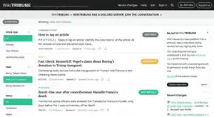 WikiTribune (stylized as WikiTRIBUNE) was a news wiki where volunteers wrote and curated articles about widely publicised news by proof-reading, fact-checking, suggesting possible changes, and adding sources from other, usually long established outlets. Jimmy Wales, co-founder of Wikipedia, announced the site in April 2017 as a for-profit site, not affiliated with Wikipedia or its support organisation, the Wikimedia Foundation.[3][4][5] Until October 2018, WikiTribune employed journalists with established backgrounds in the profession who researched, syndicated, and reported news.[6] Its website is now a redirect to WT Social.