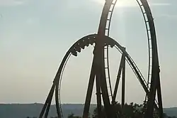 ![]() One of Wildfire's trains navigating the Immellmann loop, with the vertical loop in the foreground | |