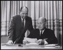 ![]() William Ballhaus, Sr. (standing) with Arnold O. Beckman of Beckman Instruments | |