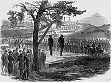 On June 8, 1863 Colonel Orton and his cousin, Lieutenant Walter G. Peters were arrested by the US Army. They were behind Union lines in Franklin, Tennessee, and were dressed as officers in the Union Army, traveled under false names, and carried falsified papers claiming that they were inspectors of the U.S. Army. Under questioning, the two gave their real names to the federal commandant, Colonel John P. Baird, of the 85th Indiana Volunteer Infantry. Baird was instructed by General William Rosecrans to have them immediately tried by court-martial. A court was convened at short notice, sat during the night, and at three o'clock in the morning of June 9, found the accused guilty of being spies. Rosecrans rejected pleads of clemency and ordered their immediate execution, which was carried out by hanging about six hours after the verdict.[15][16] The nature of Orton's mission is unclear. Orton claimed that both officers were under their way to Canada and Europe, purportedly in some secret mission for the Confederacy. The execution of Orton dismayed Robert E. Lee; although he conceded that the officers were technically in violation of the laws of war, he believed that clemency should have been shown.[17][18] Agnes Lee was deeply taken by the death of Orton; it was a trauma from which she never recovered, and it came only year after the death of her beloved sister Annie.[19]