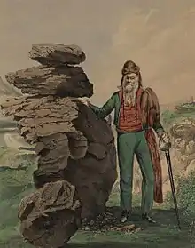 Soon returning to Wales, Price set himself up as a Druid, founding a religious Druidic group that attracted a number of followers. Little is known of the specific doctrines which he preached, but his followers walked around carrying staffs engraved with figures and letters. Declaring that marriage was wrong as it enslaved women, he began having a relationship with a woman named Ann Morgan, whom he moved in with, and in 1842 they had a daughter. He baptised this child himself at the Rocking Stone in Pontypridd, naming her Gwenhiolan Iarlles Morganwg (meaning 'Gwenhiolan, Countess of Glamorgan').[26] He began developing an appearance that was unconventional at the time, for instance wearing a fox fur hat (signifying his healing powers as a doctor) and emerald green clothing, as well as growing his beard long and not cutting his hair. He also began attempting to hold Druidic events, organising an eisteddfod at Pontypridd in 1844, but nobody turned up, and so, solitarily, he initiated his daughter as a bard at the event. In 1855 he then led a parade of the Ivorites, a friendly society that held to a philosophy of Welsh nationalism, through the streets of Merthyr Tydfil, accompanied by a half-naked man calling himself Myrddin (the Welsh name for Merlin) and a goat.[27]