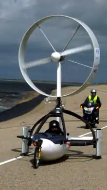 The Ventomobile was a wind-powered lightweight three-wheeler designed by University of Stuttgart students. It had a carbon-fiber rotor support that was directed into the wind and variably pitched rotor blades that adjust for wind speed. Power transmission between the rotor and the driving wheels was via two bicycle gearboxes and a bicycle chain.[24] It won the first prize at the Racing Aeolus held at Den Helder, Netherlands, in August 2008.[23]