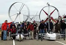 Several competitions have been held for rotor-powered vehicles. Notable among them is Racing Aeolus, an event held annually in the Netherlands. Participating universities build entries to determine the best and fastest wind-powered vehicle.[21] The rules are that the vehicles ride on wheels, with one driver, propelled by a rotor, coupled to the wheels. Temporary storage of energy is allowed, if empty at the beginning of the race. Charging the storage device is counted as race time. Racing takes place towards the wind. Vehicles are judged by their fastest run, innovation, and the results of a series of drag races.[22] In 2008, entrants were from: Stuttgart University, the Flensburg University of Applied Sciences, the Energy Research Centre of the Netherlands, the Technical University of Denmark, the University of Applied Sciences of Kiel and the Christian Albrechts University of Kiel.[23] Two top performers have been the "Ventomobile" and Spirit of Amsterdam (1 and 2).