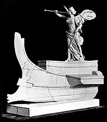 From 1875, Austrian archaeologists who, under the direction of Alexander Conze, had been excavating the buildings of the Samothrace sanctuary since 1870, studied the location where Champoiseau had found the Victory. Architect Aloïs Hauser drew the grey marble blocks left on-site and apprehended that, once properly assembled, they form the tapered bow of a warship, and that, placed on a base of slabs, they served as the basis for the statue.[9] Tetradrachmas of Demetrios Poliorcetes struck between 301 and 292 BC. representing a Victory on the bow of a ship, wings outstretched, give a good idea of this type of monument.[10] For his part, the specialist in ancient sculpture O. Benndorf is responsible for studying the body of the statue and the fragments kept in reserve at the Louvre, and restored the statue blowing into a trumpet that she raises with her right arm, as on the coin.[11] The two men thus managed to make a model of the Samothrace monument as a whole.[12]