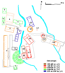 Several major naval offerings were known in the 3rd century BC. In the Greek world, such as the "bull monument" in Delos,[48] the naval monument of the agora in Cyrene[49] and Samothrace itself, the Neorion (No. 6 on the map),[50] which housed a ship about twenty meters long. In Rhodes, an offering of the same type as the base of Samothrace, but smaller,[51] was found in the sanctuary of Athena at the top of the acropolis of Lindos.