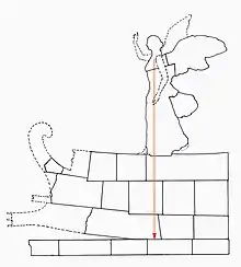 The ship is composed of 16 blocks divided into three increasingly wide assizes aft, placed on a rectangular base. The seventeenth block, which remained in Samothrace, completed the void at the back of the upper assembly, just under the statue. Its weight allowed the cantilever of the blocks of the protruding oar boxes to hold on the sides.[38] The baseboard of the statue was embedded in a basin dug on this block. Its contours, fully visible during the 2014 restoration, made it possible to determine the location of the statue very precisely.[39]