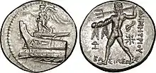 Tetradrachm of Demetrios Poliorcetes (293–292 BC). Obverse: Nike before the ship; reverse: Poseidon.