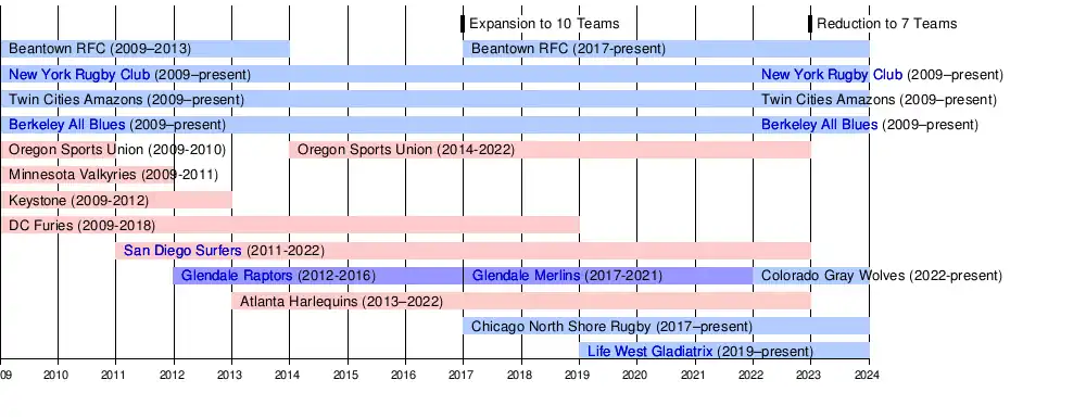 The League began with 8 clubs: Beantown Rugby, Berkeley All Blues, New York Rugby Club, Washington DC Furies, Twin City Amazons, Keystone Rugby Club, Minnesota Valkyries, and Oregon Sports Union (ORSU).[2]