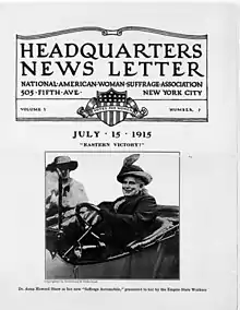 During the next few decades, MWSA continued to steadily work towards women's suffrage and allied the group with NAWSA.[110] Groups such as the Maine Federation of Labor publicly endorsed women's suffrage in Maine in 1906.[111] The Socialist Party also came out in favor of women's right to vote and MWSA president, Helen N. Bates publicly thanked them for their stance in 1912.[112] In 1913, the Maine chapter of the College Equal Suffrage League was formed and the next year, the Men's Equal Rights League of Maine was organized.[111][113] In 1915, Florence Brooks Whitehouse brought the Congressional Union to Maine.[113]
