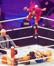 Sasha Banks (top) performing the frog splash to Charlotte Flair (with Ric Flair) and Becky Lynch (left) at Wrestlemania 32