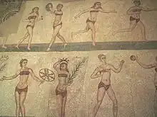 Childhood and upbringing in ancient Rome were determined by social status. Roman children played a number of games, and their toys are known from archaeology and literary sources. Animal figures were popular, and some children kept live animals and birds as pets.[9] In Roman art, girls are shown playing many of the same games as boys, such as ball, hoop-rolling, and knucklebones. Dolls are sometimes found in the tombs of those who died before adulthood. The figures are typically 15–16 cm tall, with jointed limbs, and made of materials such as wood, terracotta, and especially bone and ivory. Girls coming of age dedicated their dolls to Diana, the goddess most concerned with girlhood, or to Venus when they were preparing for marriage.[10] Noble girls were known to marry as young as 12 years of age,[11] whereas females in the lower classes were more likely to marry slightly further into their teenage years. (Boys, however, had to be at least 14.)[12][13] An example of the marriage age of noble females can be seen with Cicero's lifelong friend Atticus, who married his daughter Caecilia Attica to Marcus Vipsanius Agrippa when she was 14.[13]