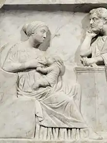 Roman wives were expected to bear children, but the women of the aristocracy, accustomed to a degree of independence, showed a growing disinclination to devote themselves to traditional motherhood. By the 1st century CE, most elite women avoided breast-feeding their infants themselves and thus hired wet-nurses.[93] This practice was not uncommon as early as the 2nd century BCE, when the comic playwright Plautus mentions wet-nurses.[94] Since a mother's milk was considered best for the baby,[95] aristocratic women might still choose to breast-feed unless physical reasons prevented it.[96] If a woman did choose not to nurse her own child, she could visit the Columna Lactaria ("Milk Column"), where poor parents could obtain milk for their infants as charity from wet nurses and more affluent parents could hire a wet nurse.[97] Licinia, the wife of Cato the Elder (d. 149 BCE), is reported to have nursed not only her son, but sometimes the infants of her slaves, to encourage "brotherly affection" among them.[98] By the time of Tacitus (d. 117 CE), breastfeeding by elite matrons was idealized as a practice of the virtuous old days.[99]