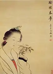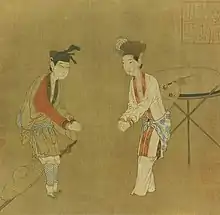 The Tang saw an increasing perception of women as a commodity. Although previously only the upper classes had concubines (Chinese: ; pinyin: qiè) in addition to one wife (Chinese: ; pinyin: ), Tang legal codes set out the formal differences between wives and concubines, as well as the children born by each. A man was legally only allowed one wife, but could, "purchase as many concubines as he could afford."[65] The legal status of a concubine was very far from that of a maid (Chinese: ; pinyin: ), with maids needing to be 'freed' (Chinese: ; pinyin: fàng) to change their position.[66] However, a concubine was expected to serve the wife in the same way as a maid, her sons were required to treat the wife as their legal mother, and, on her husband's death, she had no claims to the property he left.[65] Though wives were not supposed to be sold, the perception of women as marketable goods made it simple for husbands to sell their wives to brothel madams, such as those found in eastern Chang'an. The courtesans of Chang'an were employed to sing, converse with, and entertain customers, similar to the Japanese geisha. The girls had often been beggars or indentured to poor families. On entering the brothel, the girls took the madam's surname.[67] A way out was to either marry a client or become a concubine. Venereal diseases were recognized during the Tang and physicians document one similar to gonorrhea that was spread through sex.[68]
