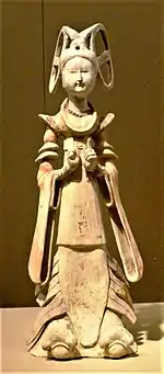 Examples of occupations pursued by women include trade (selling foodstuffs),[74] weaving, tending silk worms,[75] singing, dancing,[76] acrobatics,[77] street performance,[78] storytelling,[79] and secretary to officials.[80] Joining a religious institution was also a career choice taken by many women. Chang'an alone reportedly had 27 Buddhist nunneries and six Taoist temples with priestesses in the early 8th century.[81] The nuns participated in religious processions, such as the arrival of a Buddhist relic to Chang'an, when nuns and monks walked behind the vehicle conveying the Buddha's finger bone.[82]