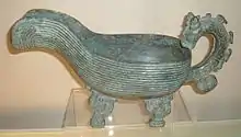 The specifications of the Zhou ritual texts regarding women were not always followed. For example, the cemetery of the Marquises of Jin in Shanxi contained 19 joint burials of the Jin lords and their wives.[31] Based on the rich burial goods, archaeologists have suggested that women's status was closer to that of the men during the 10th century BC, potentially because the Zhou dynasty rituals were not yet strictly implemented. In burials from the early 9th century, however, the quantity of bronze vessels accompanying the wives decreases markedly, suggesting that the ritual system dictating a wife's subordination to her husband was in place. The burial of a Jin lord dating to the 8th century BC, in contrast, is smaller than either tomb of his two wives, an act explicitly forbidden by the texts. This demonstrates the waning power of the Zhou government, as well as the variability in the levels of application of the rituals.[32]