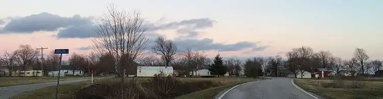 A water tower bearing the village name stands on the northern edge of Woodburn.