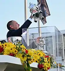 Chad Brown holding the Woodlawn Vase replica trophy, with the original Woodlawn Vase partially visible