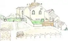In the back garden of the house is a red sandstone building, cobbled inside, which was used latterly as the woodshed and fuel store (paraffin, diesel, etc.) A collapsed stable lay to the right-hand side as viewed from the front. The floor was lined with bricks with a central drainage channel and drain. This building had been two stories high and was probably used for the farm horses, the coach or "trap" horses, usually hackneys[4] being kept in the stable off from the central courtyard of the old farm buildings. Near the old greenhouse in the back garden was an "apple rack" with several drawers for storing the crop from the orchard. This apple rack was used until the 1970s when the structure became unsound and was not replaced. The rack can be seen in the drawing illustrated here.