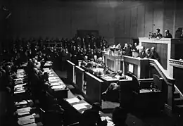 The military superiority of Germany was a defining element of Hitler's ideology and foreign policy, which made the idea of disarmament unacceptable.[17] As soon as Hitler rose to power, he began the process of rearming Germany, clearly defying both the Treaty of Versailles and the objective of the Disarmament Conference.[17] Hitler drew on the unwillingness of other countries to disarm as a justification that Germany should not be forced to do the same.[18]