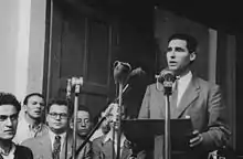 The WFDY's first General Secretary, Alexander Shelepin, was a former leader of the Young Communist International which had been dissolved in 1943. Shelepin had been a guerilla fighter during World War II (after his work with the WFDY, he was appointed head of Soviet State Security).[4] Both the WFDY and IUS vocally criticized the Marshall Plan, supported the Czechoslovak coup d'état of 1948 and the new People's republics in eastern Europe. They opposed the Korean War.[4]