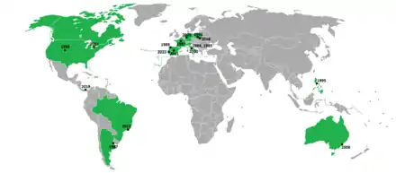 | # | Year | Date | City | Country | Continent | Attendance[25][lower-alpha 1] | Theme | Anthem | Mass venue | Notes |