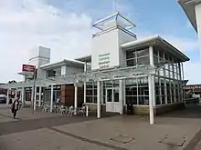 In 1998, a large shopping centre was to be built on the entire area, and the station was moved west by 400 yards (370 metres).[9] The local rail users group tried to prevent this, but failed. They did however get a large station building constructed, compared to the prefabricated open concrete shelter it replaced, and the new station was opened on 23 November 1998.[9] The line today sees Class 150 Sprinters with Class 153 Sprinters occasionally substituting. The line used to see Pacer 142 units, but these were stopped due to their ride quality on jointed track. One of the conditions the Rail Users group gave on the relocation was that if needed, space be left for future doubling of the track and a second platform, which was complied with.[10]