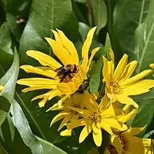 Wyethia amplexicaulis in bloom being visited by Bombus fervidus, Steamboat Lake State Park, Colorado