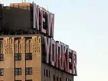 The western facade contains a sign with the name "New Yorker" in 21 ft-high (6.4 m) capital letters.[12][13] The original sign was illuminated from 1941 to 1967.[13] The sign was dark until 2005, when it was replaced with an LED sign[14][15] manufactured by LED Solution of Kitchener, Ontario.[13] The sign can be seen from northern New Jersey, across the Hudson River to the west.[12][16] Each of the letters can be illuminated separately, allowing the sign to display various messages on special occasions such as celebrations.[16]