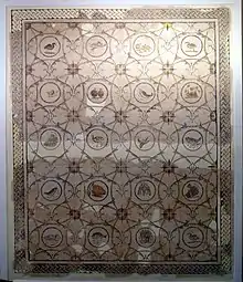 The xenia motif in Roman mosaic is a still life motif consisting of a grouping of various items, mostly edible, representing a generous offering (a xenia) from a wealthy host to guests. The items are often spread across different compartments in floor mosaic schemes. No doubt there were once paintings, but these have been lost.