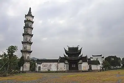 Xishan is the oldest among Xinye's ancestral halls, and is now part of the Xinye Elementary School. Youxu remains the village's main ancestral hall where the most important ceremonies are held,[7] though it is exceeded in size by Chongren Ancestral Hall of the eponymous subclan.[6] Other major landmarks include the Ming dynasty Tuanyun Pagoda (抟云塔) and Wenchang Pavilion (文昌阁).[8] Also near the village is Daci Rock (大慈岩), a Buddhist temple built on a sheer mountain cliff dating from the Mongol Yuan dynasty.[3]