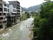 Situated on the banks of the narrow Heng River[1][lower-alpha 1] valley, a tributary of the Yangtze, the town of Yanjing, Yanjin's county seat, has been referred to as the "World's Narrowest City."[2][3] The buildings of the city are situated on tall pillars, which is a preemptive measure toward water-level rise during periods of heavy flooding.[4] Videos of the city routinely go viral because of its uniqueness and the surrounding natural environment, attracting much attention to the city.[4]