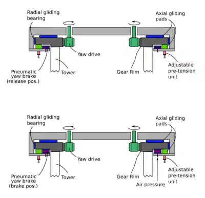 In order to stabilize the yaw bearing against rotation a means of braking is necessary. One of the simplest ways to realize that task is to apply a constant small counter-torque at the yaw drives in order to eliminate the backlash between gear-rim and yaw drive pinions and to prevent the nacelle from oscillating due to the rotor rotation. This operation however greatly reduces the reliability of the electric yaw drives, therefore the most common solution is the implementation of a hydraulically actuated disk brake.