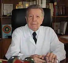 Chazov was born in 1929.[3] He was a graduate of the Kiev Medical Institute.[3] Following his graduation he worked as a clinic surgeon, and later joined the research institute of therapy of the USSR Academy of Medical Sciences.[3] He served as a managing director of the A. L. Myasnikov Research Institute.[3] Chazov was the director of the Moscow cardiological center since 1976. It is one of the largest such centers in the world, comprising 10 separate institutes. As the chief of the fourth directorate of the Ministry of Health, which took care of Soviet leaders, he was widely regarded to be a person responsible for the health of the Soviet leadership, although he sometimes denied that he was their "personal physician".[4] He was the deputy health minister and appointed minister of health in 1987.[3] Chazov was a member of the central committee of the Communist Party.[3]