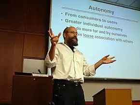 Benkler's research focuses on commons-based approaches to managing resources in networked environments. He coined the term commons-based peer production to describe collaborative efforts based on sharing information, such as free and open source software and Wikipedia.[5] He also uses the term 'networked information economy' to describe a "system of production, distribution, and consumption of information goods characterized by decentralized individual action carried out through widely distributed, nonmarket means that do not depend on market strategies."[6]