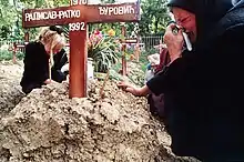 ![]() Clockwise from top-left: Officers of the Slovenian National Police Force escort captured soldiers of the Yugoslav People's Army back to their unit during the Slovenian War of Independence; a destroyed M-84 during the Battle of Vukovar; anti-tank missile installations of the Serbia-controlled Yugoslav People's Army during the siege of Dubrovnik; reburial of victims of the 1995 Srebrenica massacre in 2010; an armoured vehicle of the United Nations Protection Force during the siege of Sarajevo. | |||||||