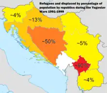 The Kosovo War caused 862,979 Albanian refugees who were either expelled from the Serb forces or fled from the battle front.[161] In addition, 500,000 to 600,000 were internally displaced,[162] which means that, according to the OSCE, almost 90% of all Albanians were displaced from their homes in Kosovo by June 1999.[163] After the end of the war, Albanians returned, but over 200,000 Serbs, Romani and other non-Albanians fled Kosovo. By the end of 2000, Serbia thus became the host of 700,000 Serb refugees or internally displaced from Kosovo, Croatia and Bosnia.[164]