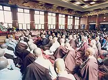 In Chinese Chan, the usage of esoteric mantras in Zen goes back to the Tang dynasty. There is evidence that Chan Buddhists adopted practices from Chinese Esoteric Buddhism in findings from Dunhuang.[108] According to Henrik Sørensen, several successors of Shenxiu (such as Jingxian and Yixing) were also students of the Zhenyan (Mantra) school.[109] Influential esoteric dhāraṇī, such as the Uṣṇīṣa Vijaya Dhāraṇī Sūtra and the Nīlakaṇṭha Dhāraṇī, also begin to be cited in the literature of the Baotang school during the Tang dynasty.[110] Many mantras have been preserved since the Tang period and continue to be practiced in modern Chan monasteries. One common example is the Śūraṅgama Mantra, which has been heavily propagated by various prominent Chan monks, such as Venerable Hsuan Hua who founded the City of Ten Thousand Buddhas.[111] Another example of esoteric rituals practiced by the Chan school is the Mengshan Rite for Feeding Hungry Ghosts, which is practiced by both monks and laypeople during the Hungry Ghost Festival.[112][113][114] Chan repentance rituals, such as the Liberation Rite of Water and Land, also involve various esoteric aspects, including the invocation of esoteric deities such as the Five Wisdom Buddhas and the Ten Wisdom Kings.[115][116]