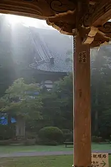 Depending on the tradition, esoteric methods such as mantra and dhāraṇī are also used for different purposes including meditation practice, protection from evil, invoking great compassion, invoking the power of certain bodhisattvas, and are chanted during ceremonies and rituals.[103][104] In the Kwan Um school of Zen for example, a mantra of Guanyin ("Kwanseum Bosal") is used during sitting meditation.[105] The Heart Sutra Mantra is also another mantra that is used in Zen during various rituals.[106] Another example is the Mantra of Light (kōmyō shingon), which is common in Japanese Soto Zen and was derived from the Shingon sect.[107]