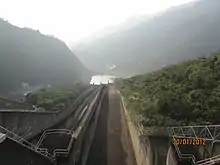 The concrete spillway was constructed to the north (right bank) of the dam and consists of a multi-level open channel controlled by three radial gates. Due to a large volume of unstable sandstone, clay and shale that comprised the slope where the spillway was to be built, about 6,040,000 cubic metres (213,000,000 cu ft) of material had to be removed before concrete placement could begin. Construction of the spillway was carried out simultaneously with the main dam. The spillway can discharge up to 9,470 cubic metres per second (334,000 cu ft/s) when all the gates are open.[12] The dam is also equipped with two sluice gates for de-silting operations, and two flood outlet tunnels with 160 cubic metres per second (5,700 cu ft/s) capacity.